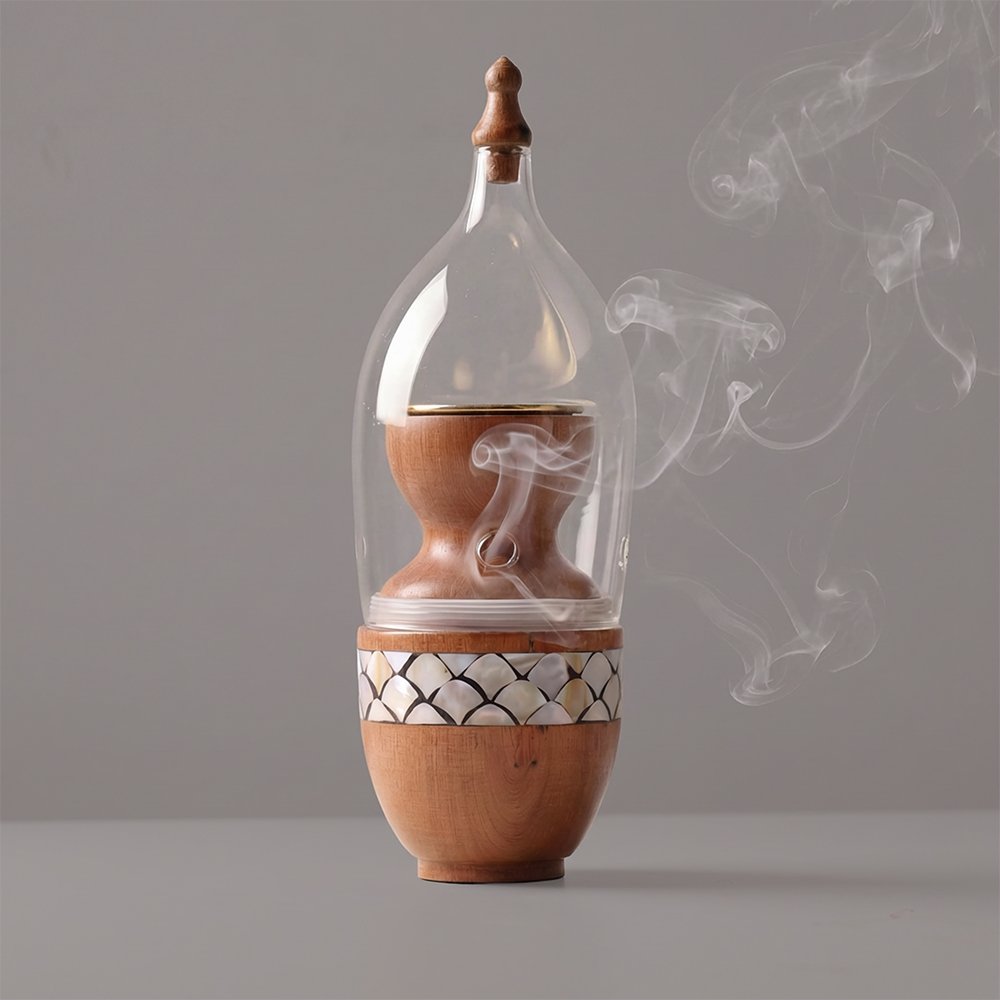 An elegant and smart mubkhar, professionally handcrafted from wood and inlaid with attractive mother-of-pearl. It features a thoughtfully designed lid with intelligent openings that allow incense to diffuse in multiple ways, ensuring balanced and safe perfuming, suitable for hair and beard. Finished with three distinctive engraved patterns that add a refined aesthetic touch.